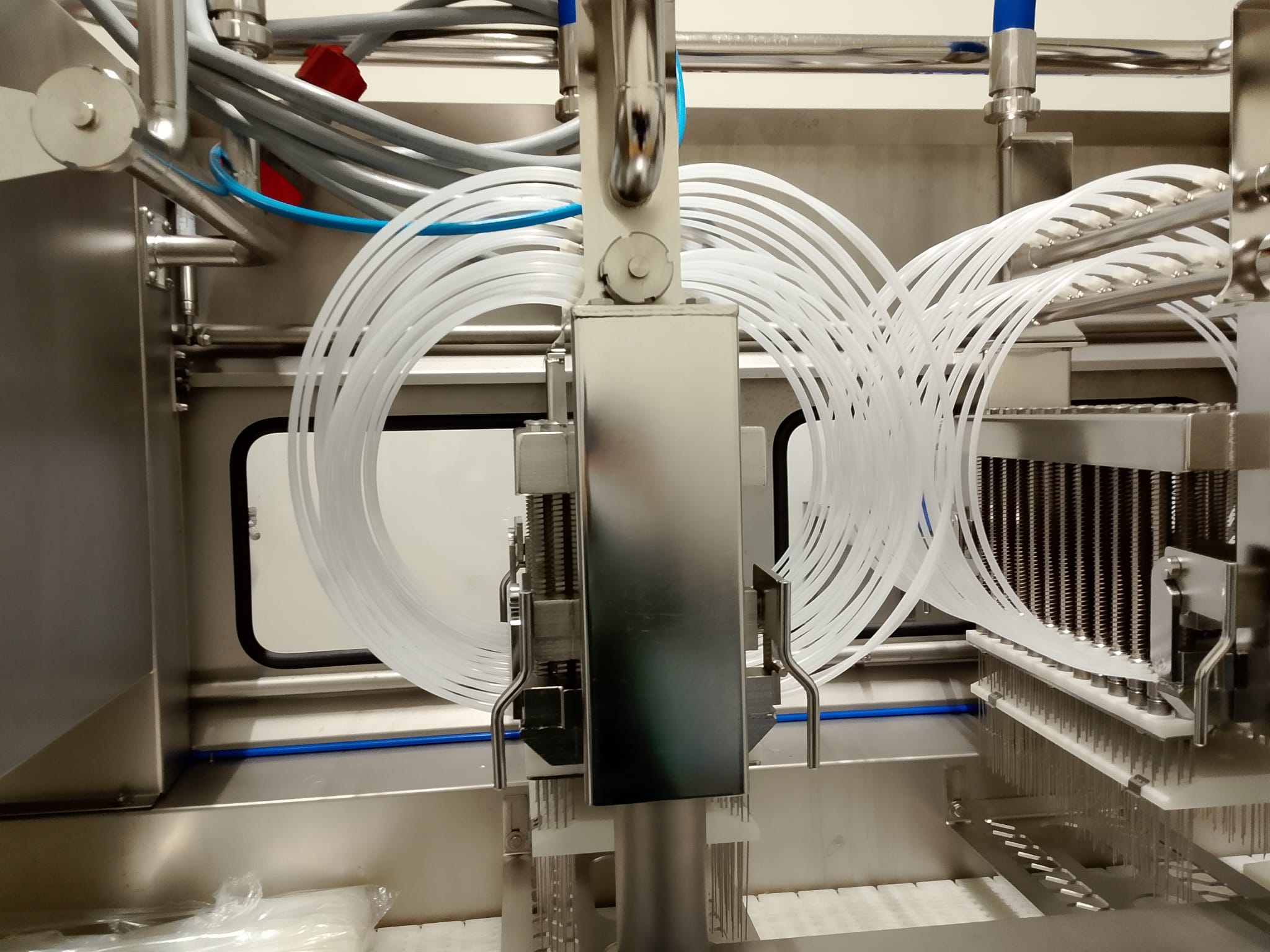 Fomaco FGM 48f injector is designed with needle heads and valves that accurately match the liquid flow rate throughout the system, preventing brine residue from settling at the valve entrances. It is also equipped with an automatic wash program, and components such as the conveyor belt frame and needles can be removed without the need for tools. Additionally, all pipes are fitted with dairy fittings, allowing easy dismantling for inspection purposes.